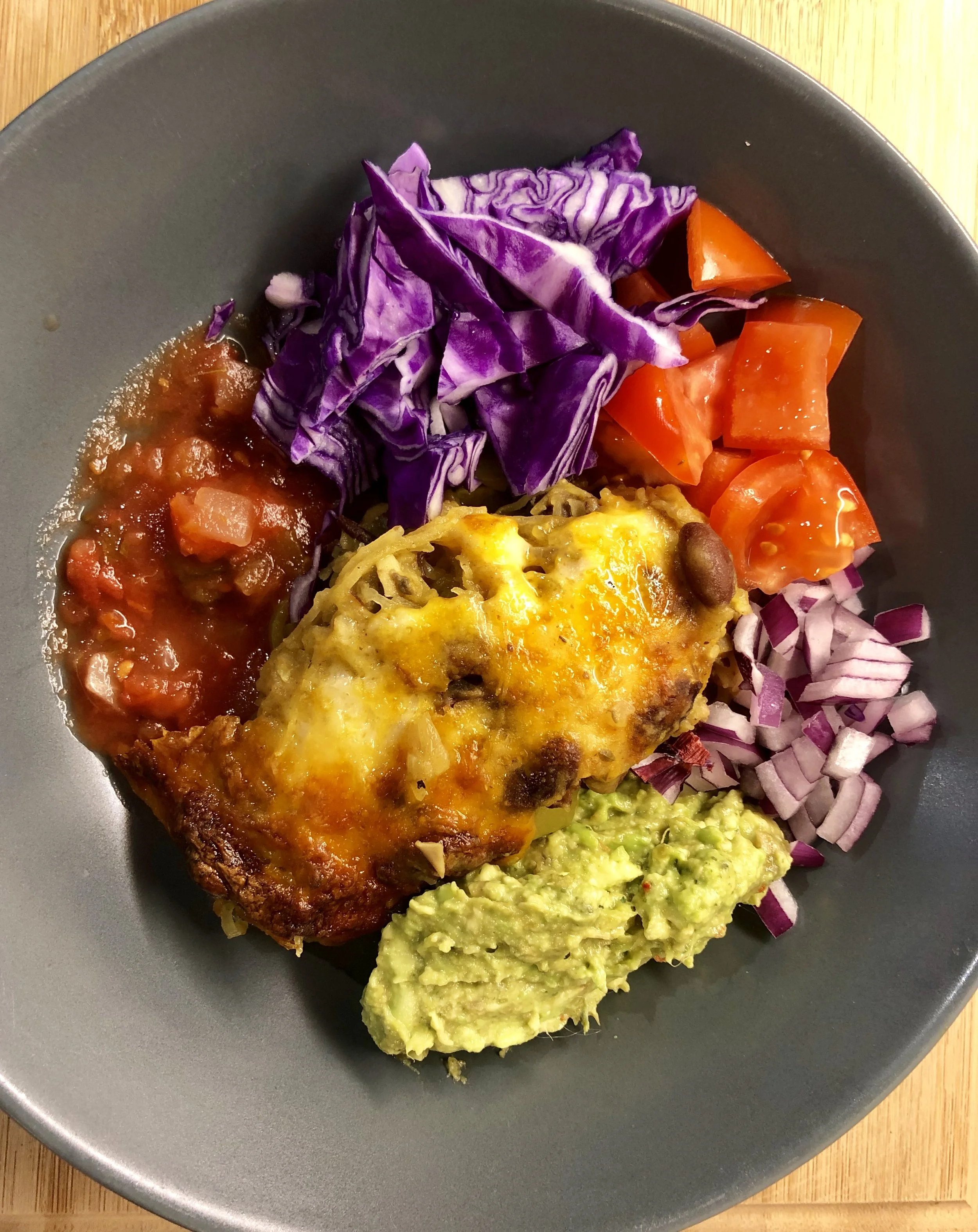 Remove from the oven and let sit for a couple of minutes and serve with your choice of sides. I chose to serve it with raw red onion, guacamole, chopped red cabbage, fresh chopped tomatoes and salsa.